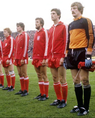 80年頃のポーランド代表で、GKのムイナルチク選手のスパイクに比べ、他の方はシルバーに見えます。黒いくつずみで磨いたためかもしれませんが…。