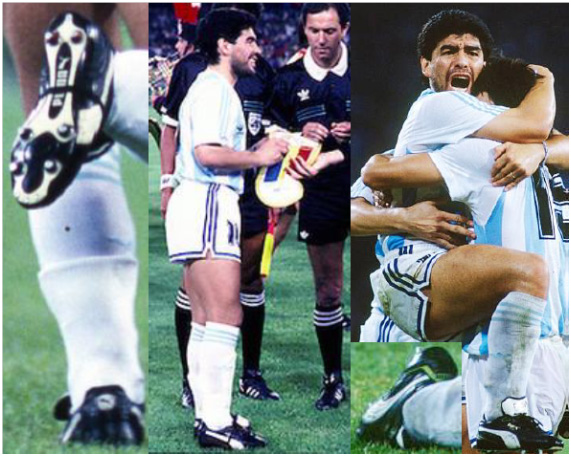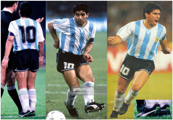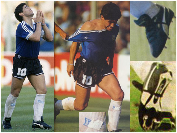 Argentina, the previous champion, was unseated by Cameroon in the opening game and went into the next game against the Soviet Union hoping for a must-win, but for some reason, Diego wore a different model of boots than the opening game. The upper of Soviet model was similar to the Cameroon model, but the heel was the conventional pattern.