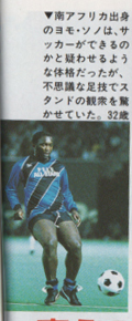 88年に行われたOB世界選抜対OB日本代表戦です。後列左から2番目、ベスト選手とロッシ選手の間がJOMO SONO選手です。会場はできたばかりの東京ドームでした。人工芝なので、多くの選手がプーマのインドア用シューズを履いておられました。