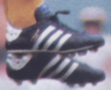当時は珍しい白スパイクも発売され、今もかなり高額で出品されているのを見ます。白も黒もアディダスにしては珍しいルーマニア製です(白の取替え式は西ドイツ製のようです)。広告のモデルはどちらかというと廉価版ぽいグレードで、プロ選手が履くようなモデルではない気がします。