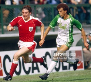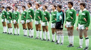西ドイツを破る大金星をあげたアルジェリア代表チーム。アディダスのスパイクにプーマラインを書いて使っていたユニークな選手もいましたが、トレロ愛用者もおられました。