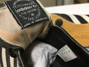 こちらはまだ3本線がソールまで伸びているタイプです。かかとのトレフォイルも黒地に白のパターン。
