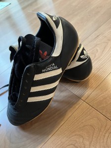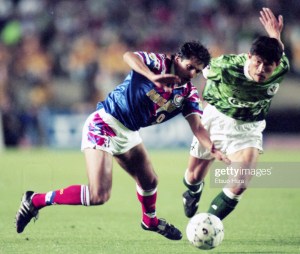 取替え式を好む選手だと思ってきたので意外でしたが、この時期(93年)では珍しく3本線がかかとまで伸びたタイプでした。