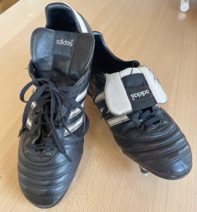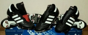このデサント時代の青マークで、取替え式モデルはこのシリーズぐらいしか記憶にないですが、3本線は途中で切れていないし、6本スタッドのようで、西ドイツ時代のWORLD CUPのようです。