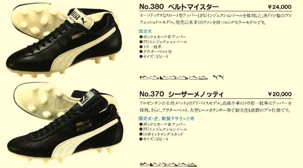 ベルトマイスターはドイツ語ですが、日本のみの呼び名ですので、海外では80年代も「WORLD CUP」でした(南米ではBORUSSIA)。なぜかまだ黒シュータンの写真ですね。このカタログにはドイツ語と英語表記があり、boxcalf leather (Boxcalfleder)の表記があります。