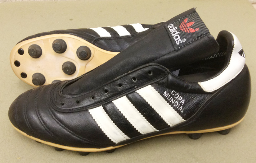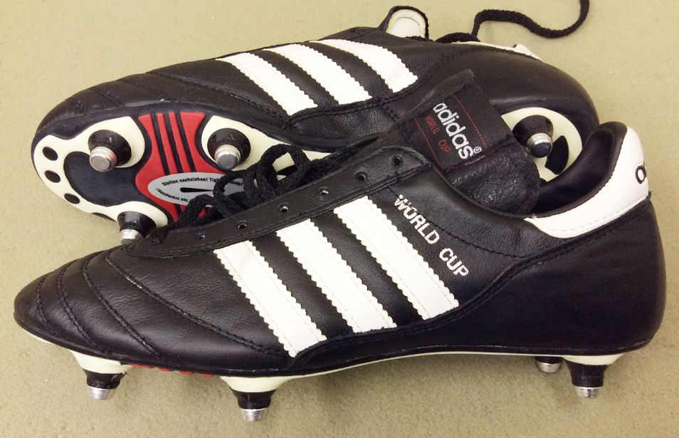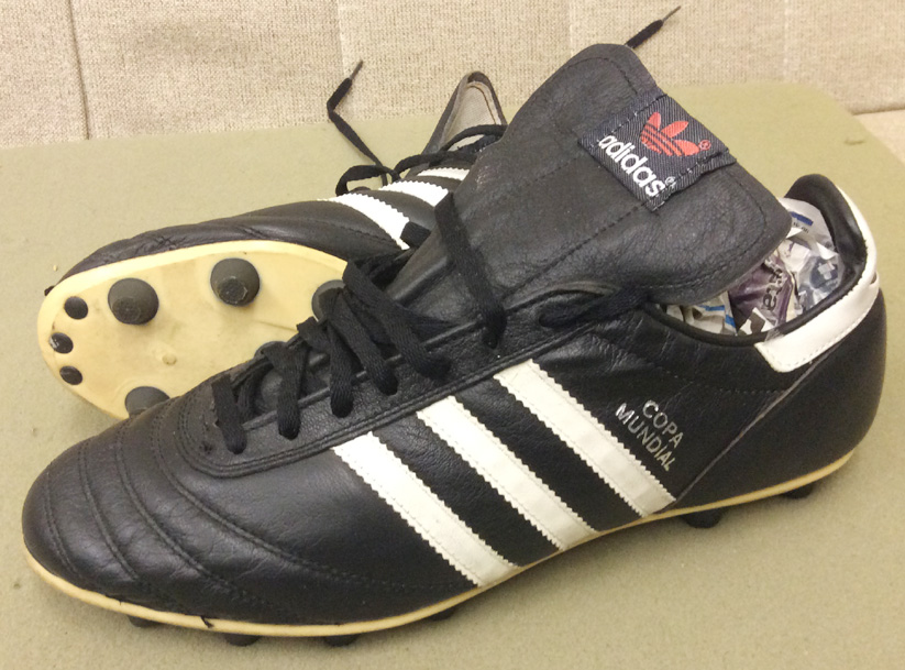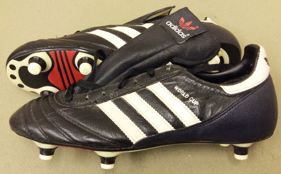 現行版はマーク部分はトレフォイルではなく、adidasの文字になりました。90年代前半はこれらの微妙に異なるデザインのWORLD CUP(及びコパムン)が混在していたと思われます。