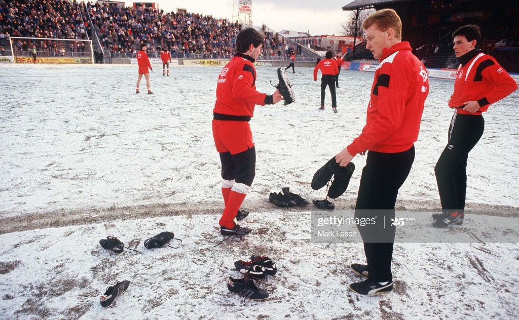 11/1/1987 Crystal Palace v Nottingham Forest, Forest players test their footwear before the match on the frozen pitch – l to r Nigel Clough, Brian Rice and Steve Chettle. (Photo by Mark Leech/Getty Images)