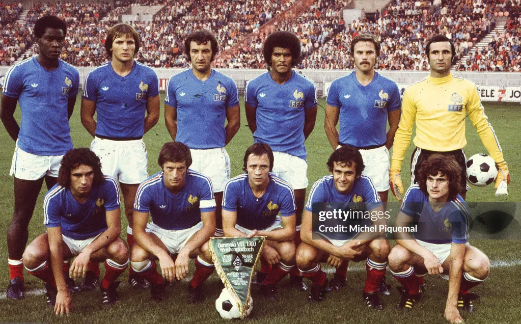前列右端のシス(シクス)選手が黄色い3本線のスパイクを履いています。1976年のフランス代表ですので、このモデルかBOGOTAか?