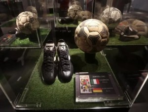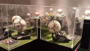 偉大なフットボーラー10人(W杯各10大会)のシャツ、ブーツ(スパイク)、ボールなどの展示会で、コレクターさんの持ち物だそうです。