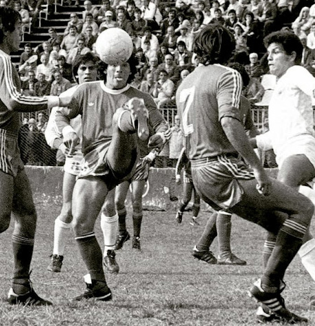 図13 86年W杯決勝トーナメント1回戦、10本スタッドのスパイクを履いて、ディエゴ様をマークするウルグアイ代表のグティエレス選手。