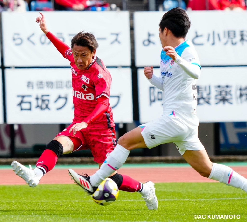 図4 25本スタッドのパラメヒコを履いてプレーする金久保順選手(2020年サンガ在籍時(左)、2021年ホーリーホック在籍時)。
